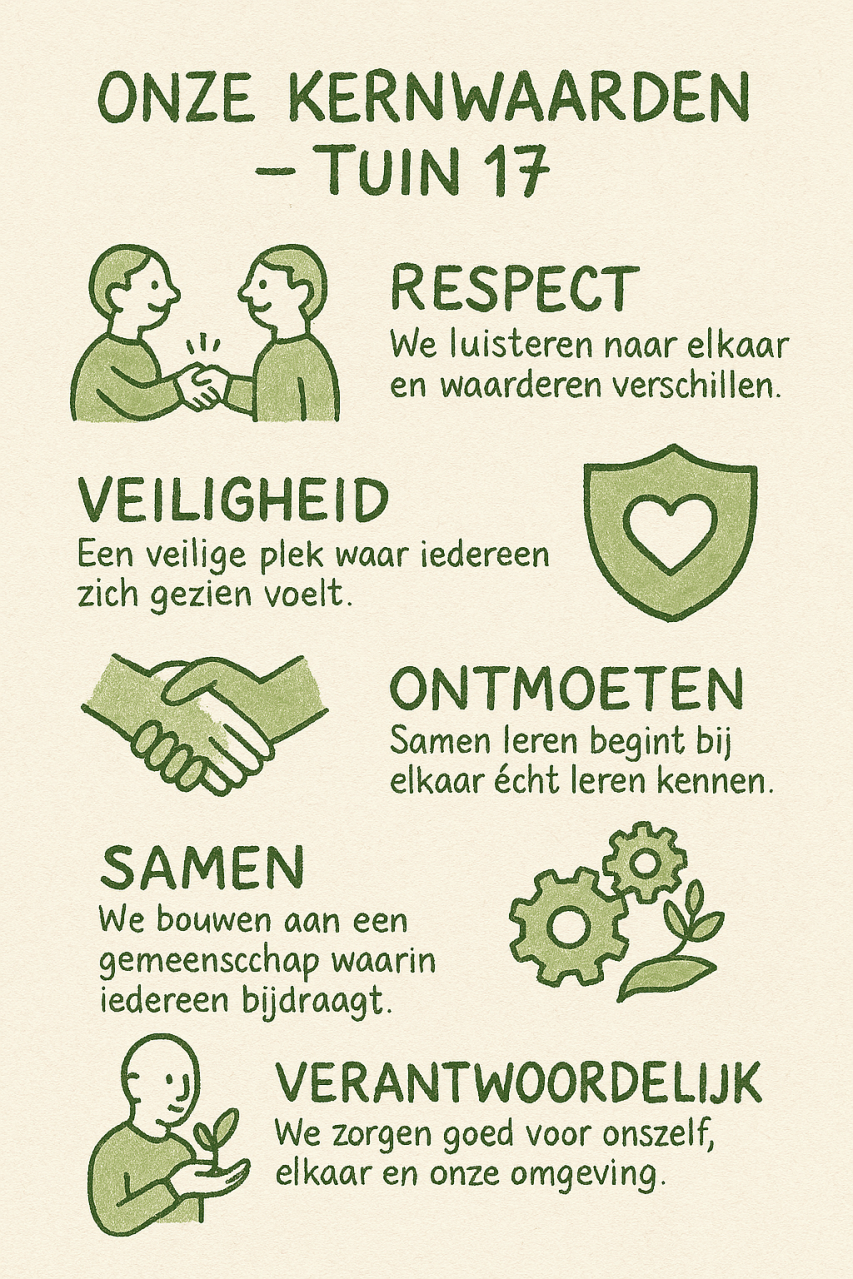 Binnen ons onderwijs hechten wij erg veel waarde aan de kerwaarden van Tuin 17: