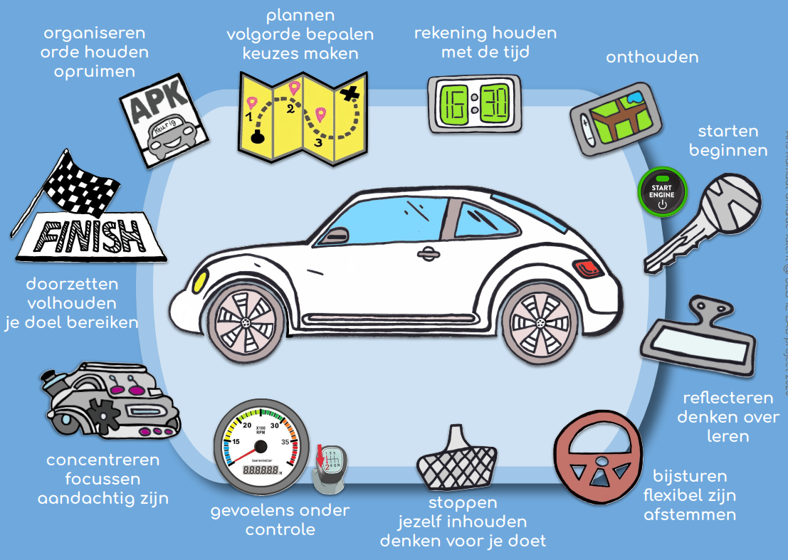 Naast bovenstaande competenties, besteden we ook veel aandacht aan het aanleren van de zogenaamde executieve vaardigheden. Ze hebben te maken met het leren omgaan met je eigen emotie en gedrag. Hoe regel je jouw eigen emotie, reactie, aandacht en/of concentratie? Hoe onthoud je iets? Hoe blijf je bij een taak of opdracht? Hoe plan je iets? Wat is belangrijk? Deze vaardigheden vormen de basis voor een goede werkhouding waardoor een leerling tot leren kan komen. Wij gebruiken de autometafoor om deze vaardigheden eigen te maken en zichtbaar te maken.